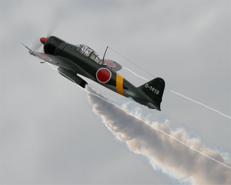 謎だらけの前口上を述べているうちに、ファン・リー氏から連絡が入りました。 「SKYRER ZERO,Request Three Times Low Approach」 管制から許可が降り、「あの機体」が進入してきました。 かなり低いです。 雲が低いので、低空でローパスするとは聞いていましたが、はりきってアクロ機並の低さで進入。 低空を高速でローパスしていきました。 二回目の航過では翼を振ってご挨拶。 そして、大きく旋回して、最後の航過にはいります。 今度は高速で航過。 滑走路端で機首上げをしたと思ったら・・・・ 爆発音とともに増槽からスモークをはき、翼端からベイパーをひきつつ、あっというまに雲の中に・・・・ とても、レシプロ機とは思えません。まるで、ジェット機の機動です。 「驚いたでしょう。これが山中式補助噴進装置です」 と、無線でファン・リー氏。 旧日本海軍の山中大尉の考案、作成になる固体ロケット・モーターなのだそうです。 あれは増槽ではなく、補助ロケットだったのです。 零戦の非力なエンジンを補助するために開発されたそうですが、戦況の悪化に伴い開発は中断。考案者の山中大尉も南洋で行方不明となってしまったそうです。 〈大空魔竜〉が回収したのは、この山中大尉機なのですが、大尉がどうやってロケットを製作し、宇宙に進出したのかは、まったく不明です。 そもそも、あの程度のモータでは、大気圏を抜けることすらできないと思うのですが・・・ 宇宙は謎に満ちてますね〜 |