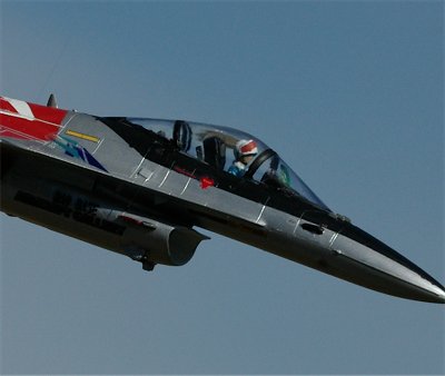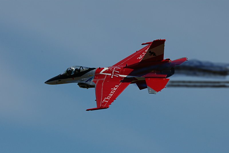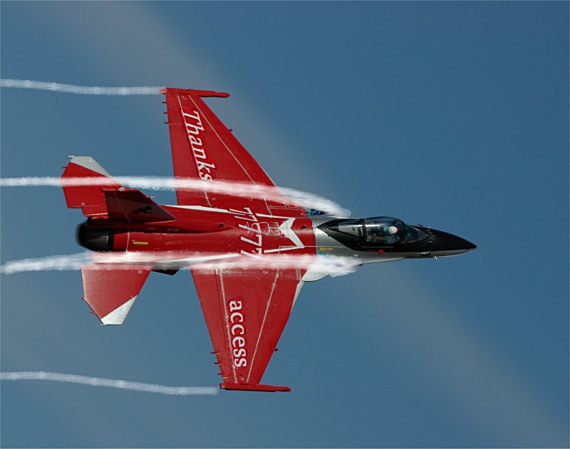 | まずは,360度ターン。F-16系の機体特有のベイパーが良いですね。 続いて、U警備隊お得意の対地攻撃機動。そして、ハイレート・クライム。 |