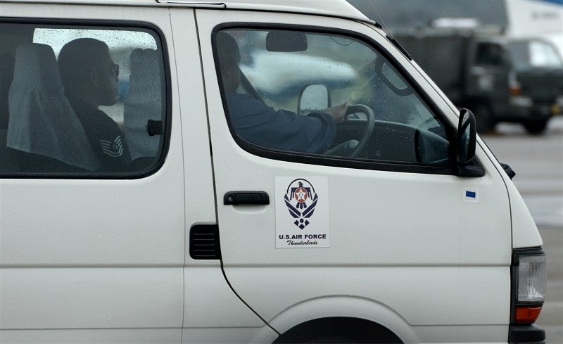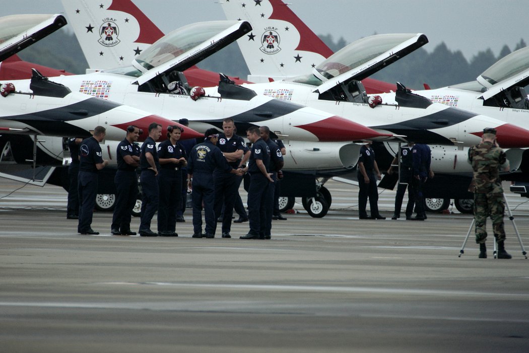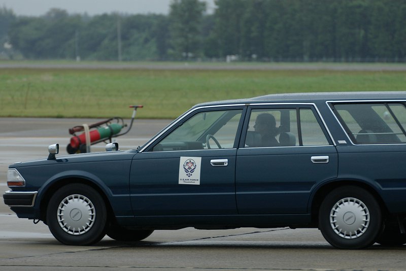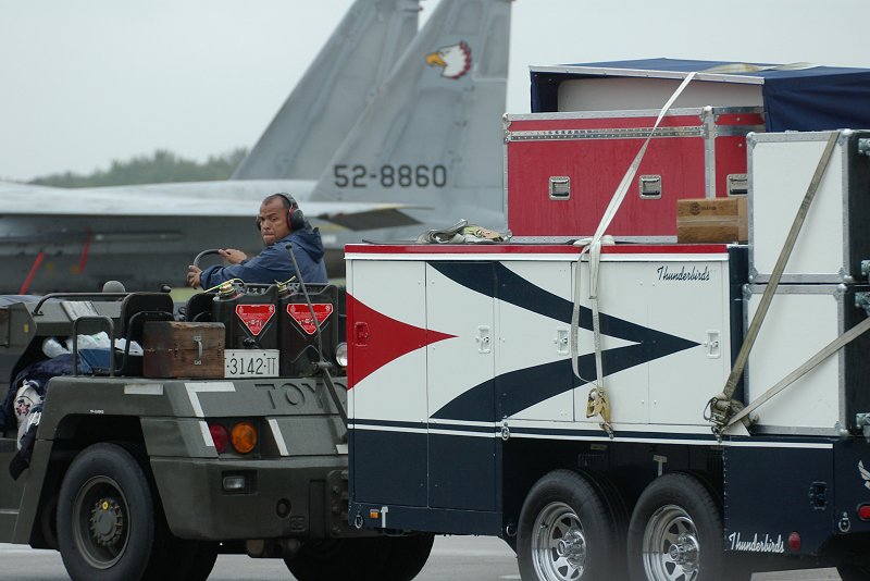 サンダーバーズといえども、F-16だけで動いているわけではありません。2ないし3機のC-130に支援機材を積んで移動しているようです。左上は、バーズの移動司令部。撤収のためコンパクトにまとめられてしまっています。中上と右上はバーズ専用車、と言いたいのですが、どうも百里基地で借りた車両にステッカーを貼っただけのようです。