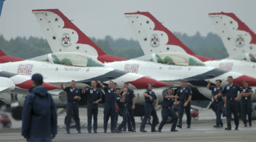左下は、同様にデモを断念し、帰投するブルーインパルスを見送るサンダーバーズ御一行。