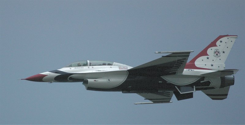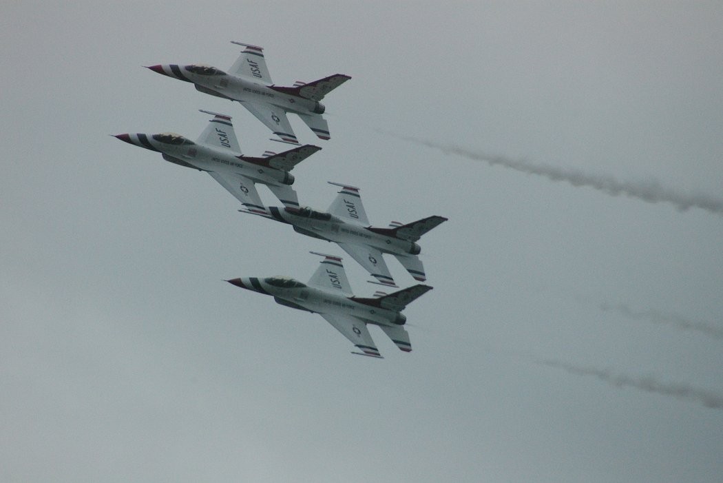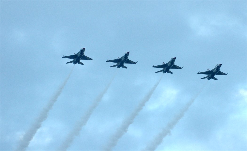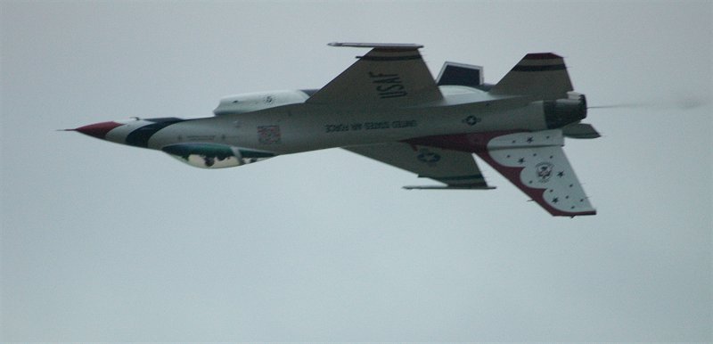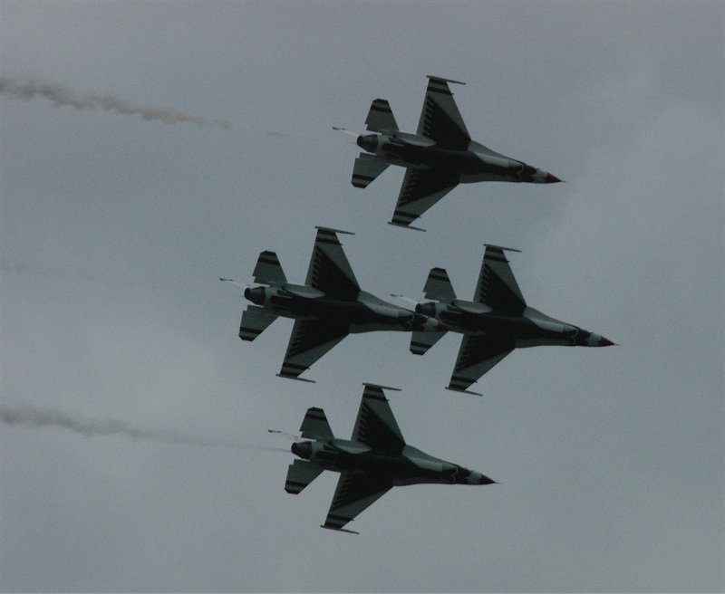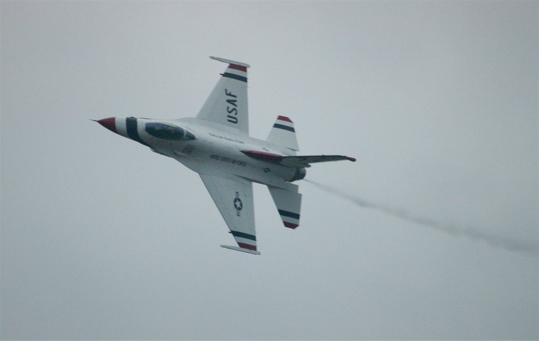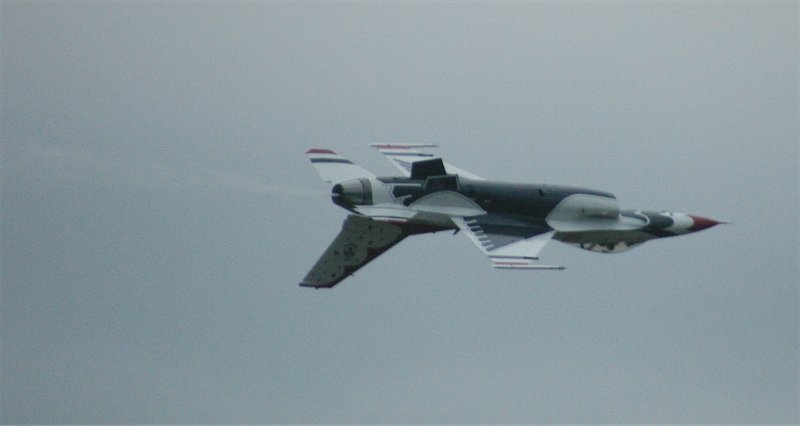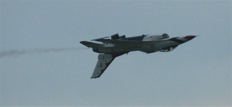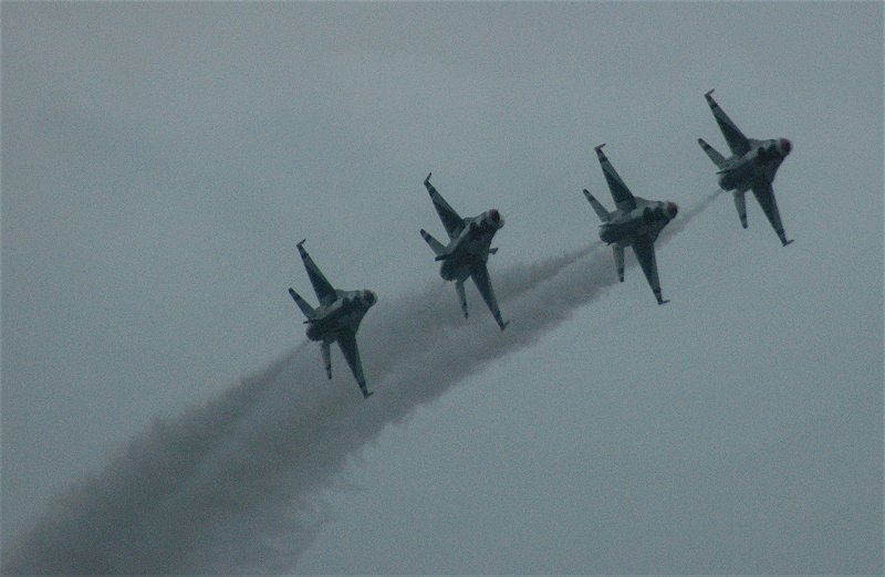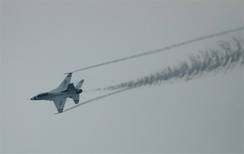 チェンジ・オーバー・ターン(左上)にライン・アブレスト(上)。曇天でうまく露出が合わないのですが、格好良いです。 ソロの演技も大迫力です。 サンダーバード5号のスロー・ロール(左、下2枚) |