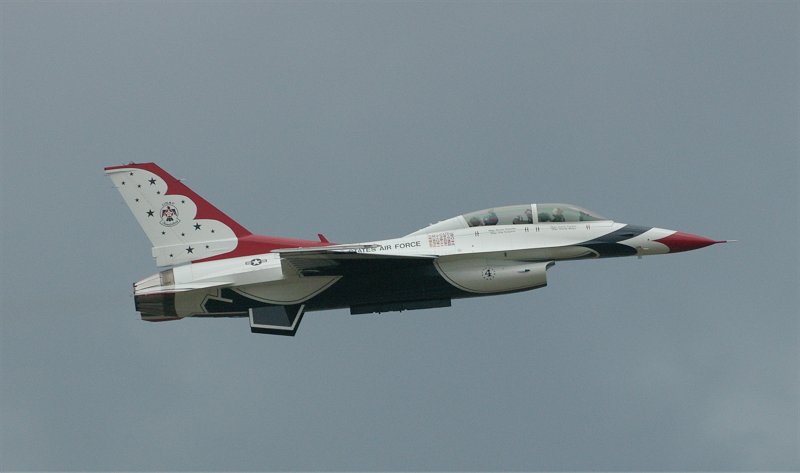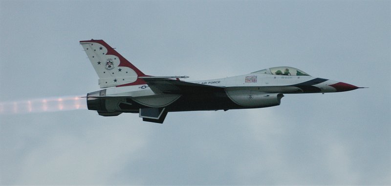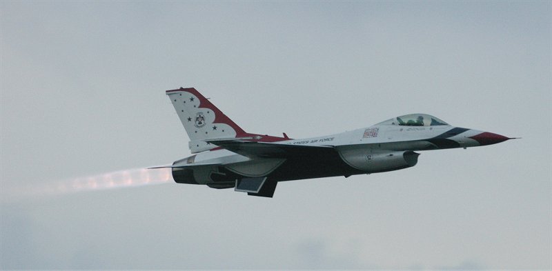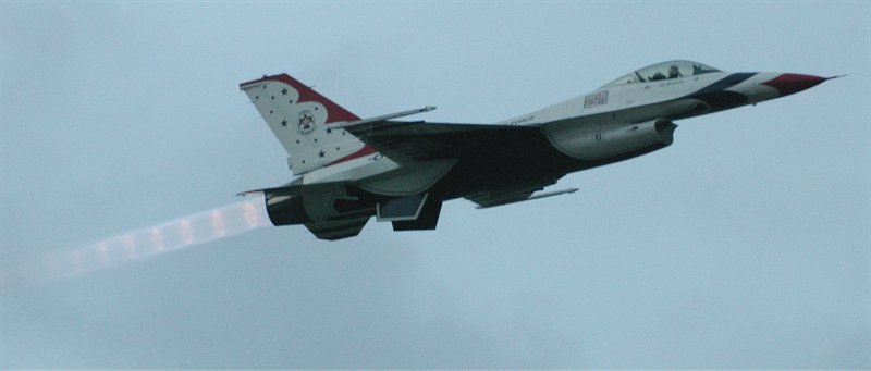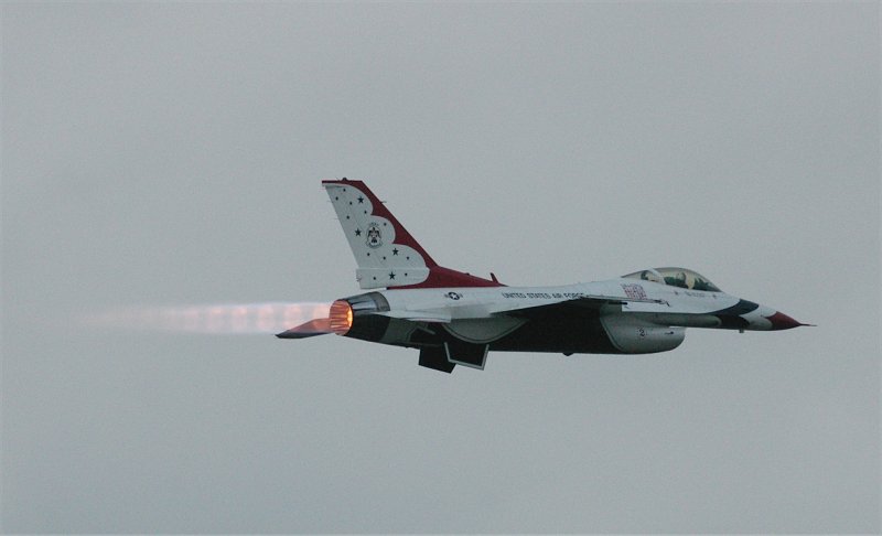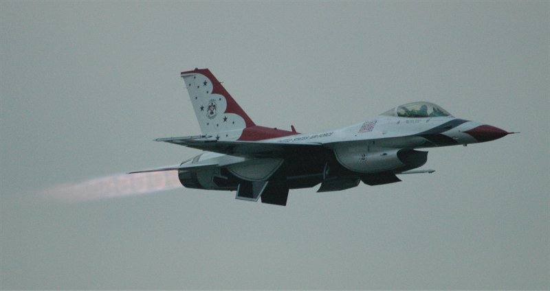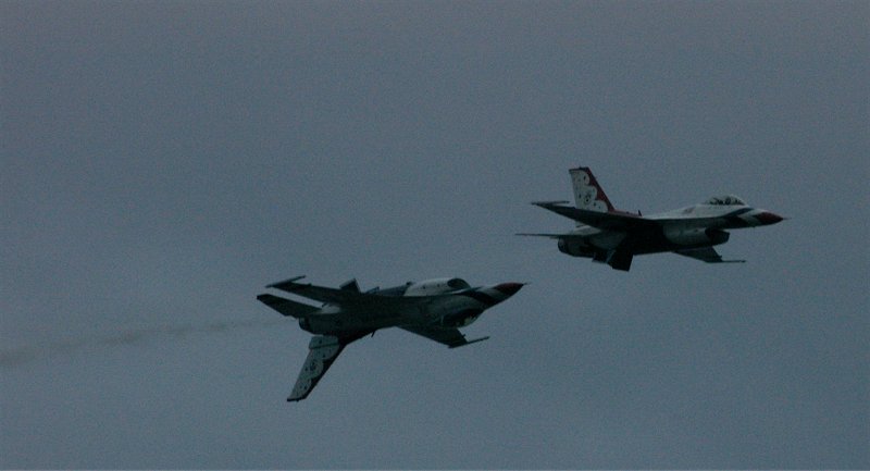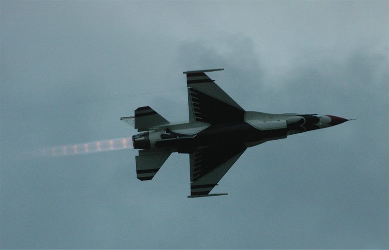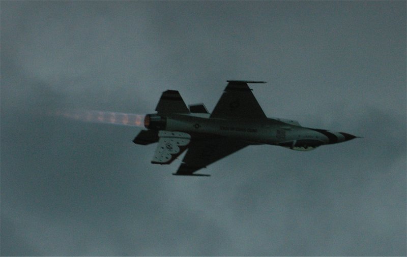 曇天、夕方という条件でも良いことがあります。 それはアフター・バーナーが綺麗に写るということです。 左、左下はアフター・バーナーに点火して離陸するサンダーバード4号。 複座の予備機を使用しています。 青いヘルメットのお客さんが乗っているようです。 |