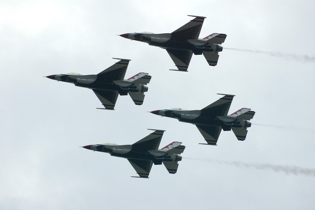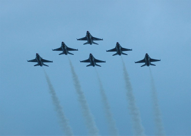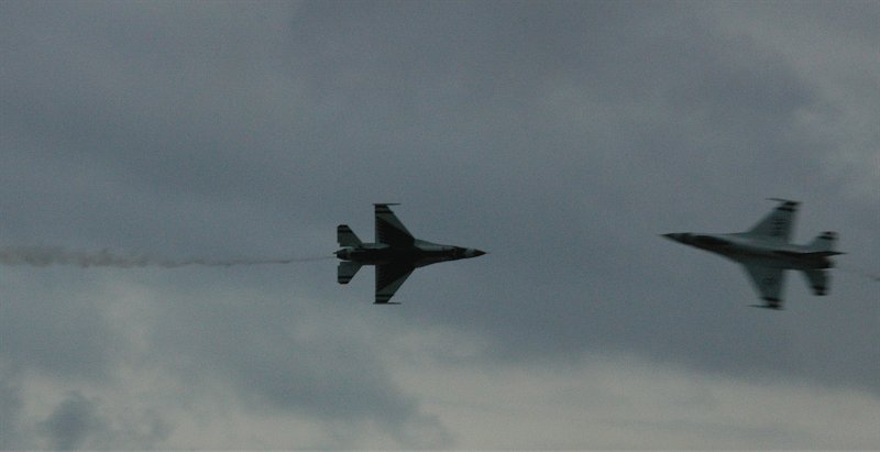 次々と離陸するサンダーバード! 1号(左)、2号(左下、下) アフター・バーナーが実に綺麗です。 |