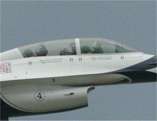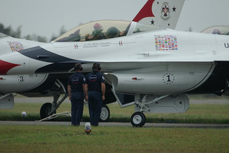 日米のアクロ・チームのクロス・オーバーです。 上はおのおののチームの1番機を記念撮影のために並べたところです。 実はナンバーこそ「1」ですが、それぞれ予備機を使用しているようです。 このとき、ブルーインパルスもサンダーバーズも1番機が2機存在していたことになります。 さて、最初に書いたのとは逆に、今度はバーズ・パイロットがお客様(左) と、もりあっがった予行ですが、本番はご存じのとおり・・・ |
