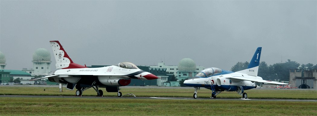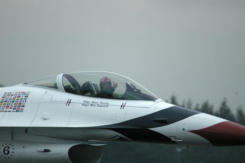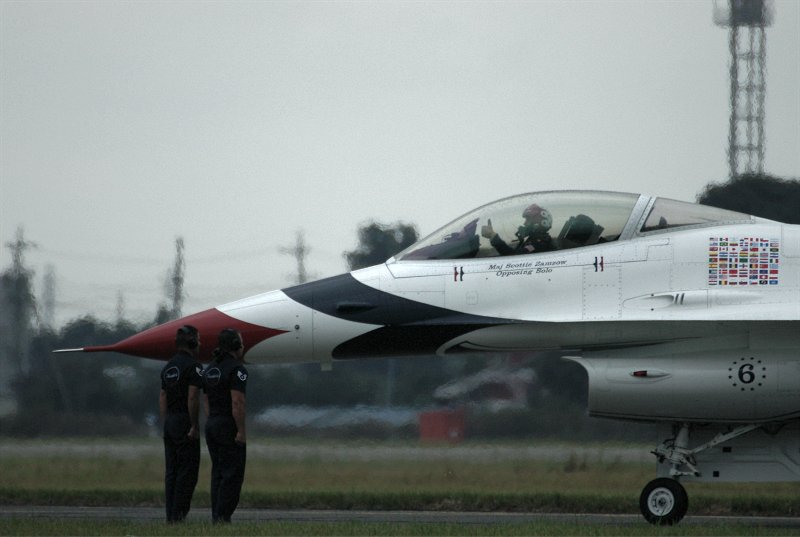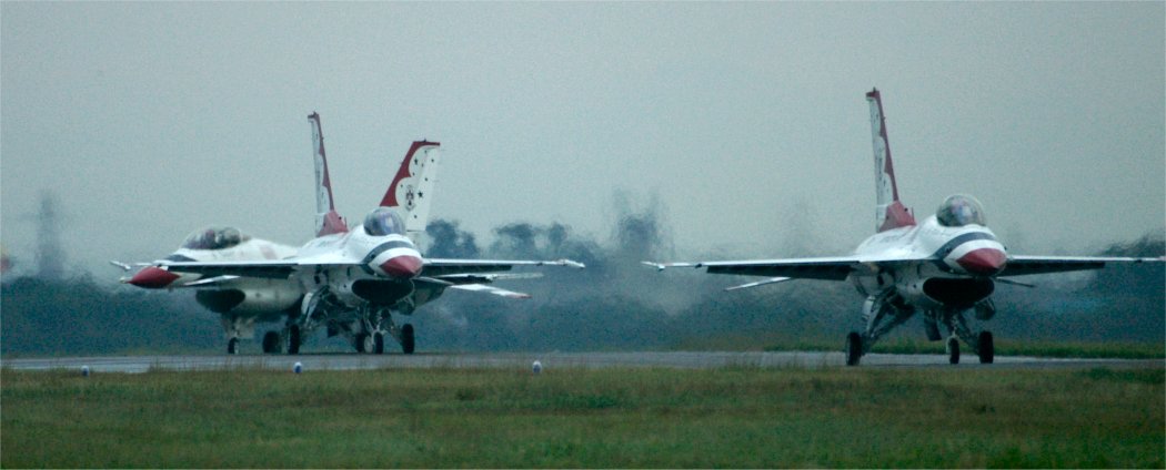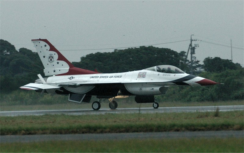 | 曇りときどき雨・・・ 午前中の快晴はどこに行ったのか・・・ 南基地にてデモフライトの準備をするサンダーバーズ。 しかし、バーズのフライト準備完了と同時に、大粒の雨が降り出す・・・ 6機のF-16が悔しそうに北基地展示エリアへと雨の中をタクシーしていく。 雨の切れ間をねらってブルーインパルスが第六区分で予行を実施。 降りてきたブルーを見届けた人々が家路につこうとしたそのとき、 バーズが再度予行に挑むことが伝えられる。 ウォーク・ダウン、そして滑走路へ。 またもや、雨足が激しくなる。 中止か? 滑走路端で天候回復を待つ6機のF-16。 やがて、日没。決断が迫られる。 こころもち雨足が鈍ったそのとき、サンダーバード4号がウェザーチェックに飛び立つ。 そして、次々と飛び立つ雷鳥!! Thunderbirds are GO!! Take Off Formation Solo Landing BLue&Birds |