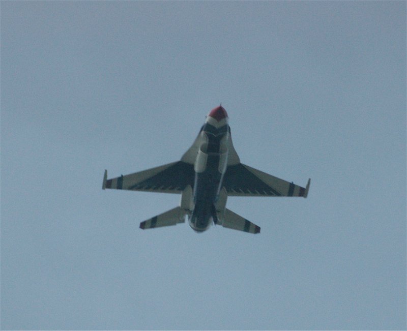 | このサンダーバード4号が展示空域のウェザーチェックをしている間中、気が気ではありませんでした。(上2枚) 何しろ、これが降りてくるときは展示飛行が中止される時なのですから。 しかし、心配は不要でした。 |