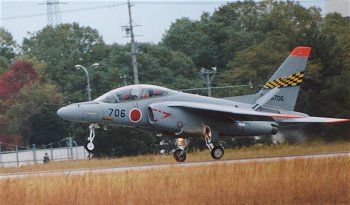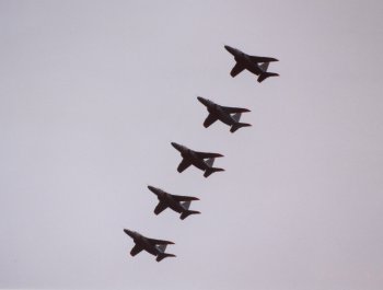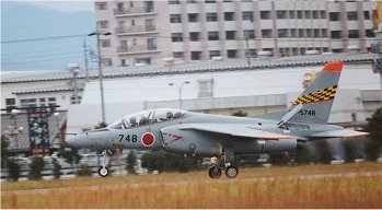 | 雨にもかかわらず基地周囲にはカメラを構えた同業者(?)が散在し、広報館にもちらほら脚立組の姿がみえます。 やがて、横列5機編隊(写真左上)のT-4が飛来し、一機づつブレイクし、(写真左上)で着陸体制に入っていきます。 続いて、さらに5機が進入し、同じくコンバット・ローリング・ピッチを行い、次々と着陸してきます。(写真下) |