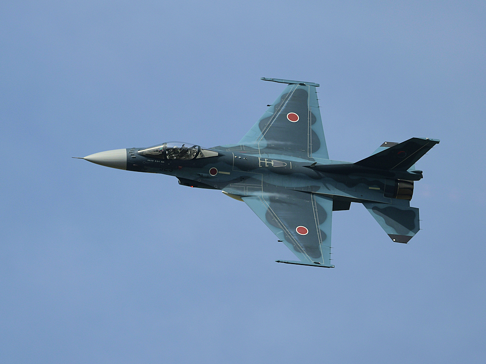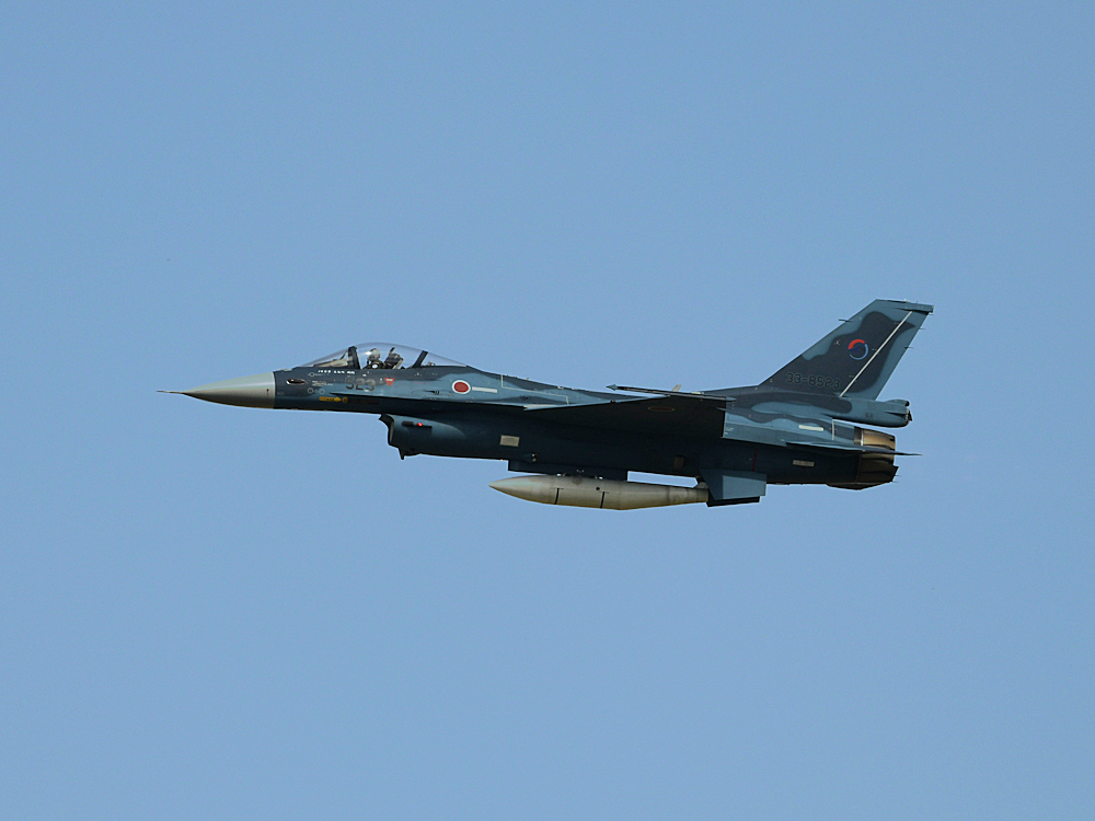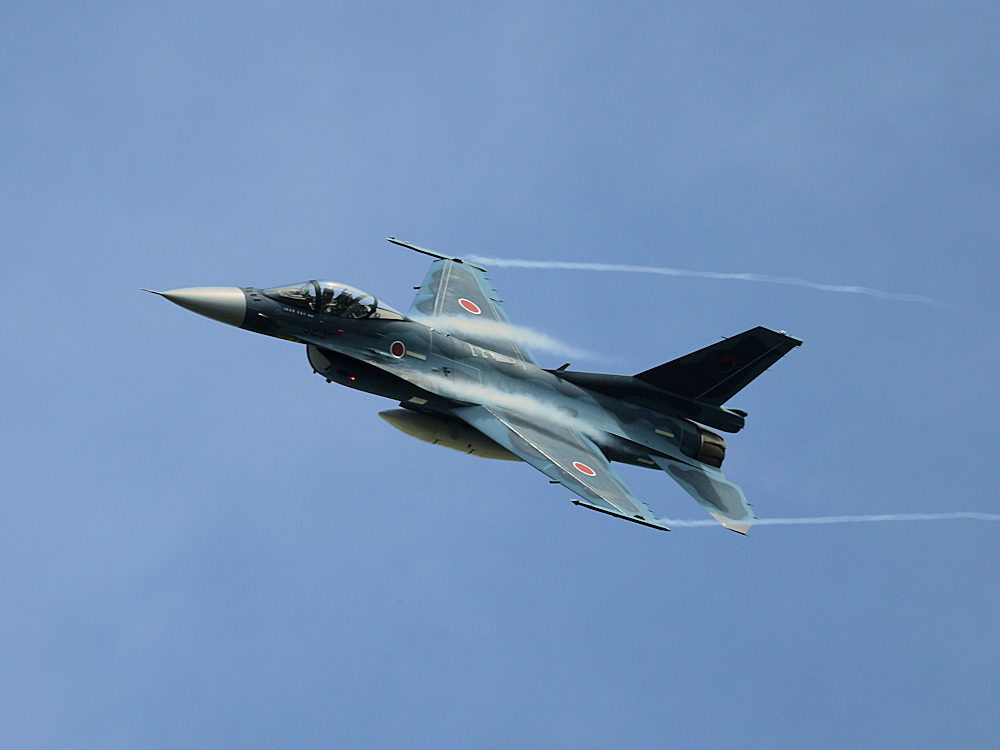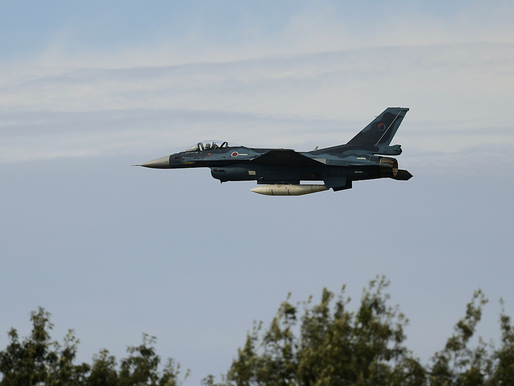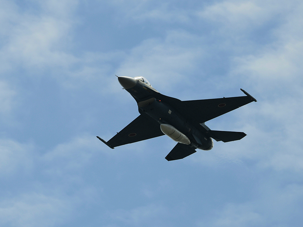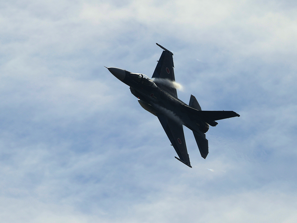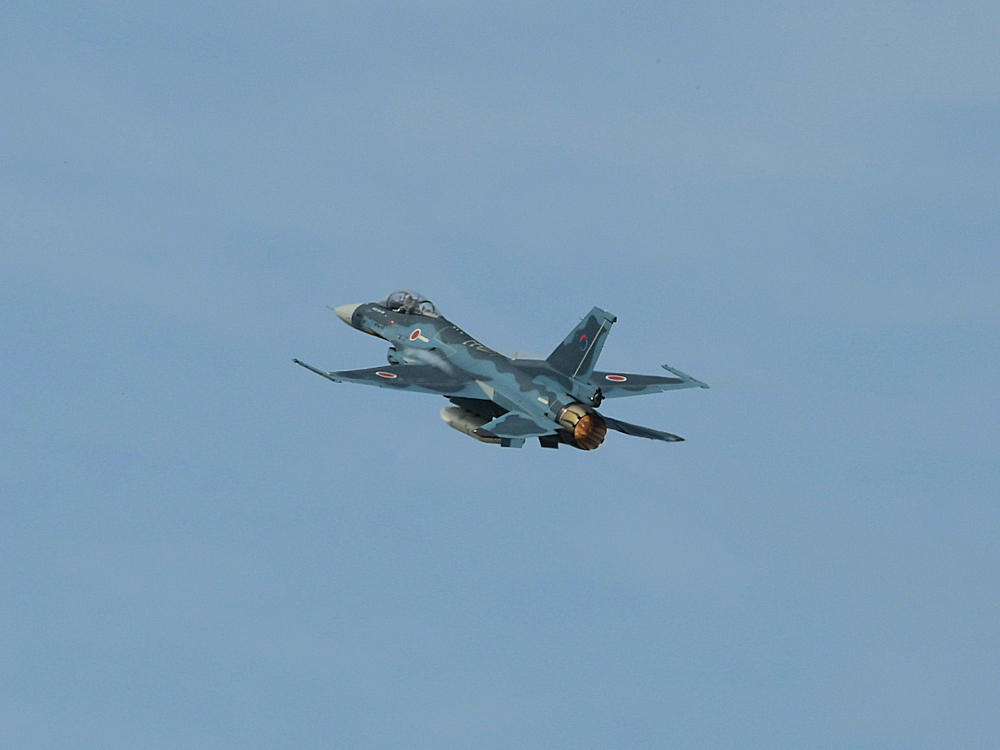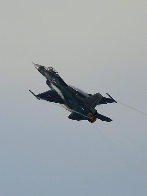 定刻が近づくと、F-15DJが離陸し、その後、F-2Aが離陸。機動飛行の予行開始。ようやくの飛行再開です。 |