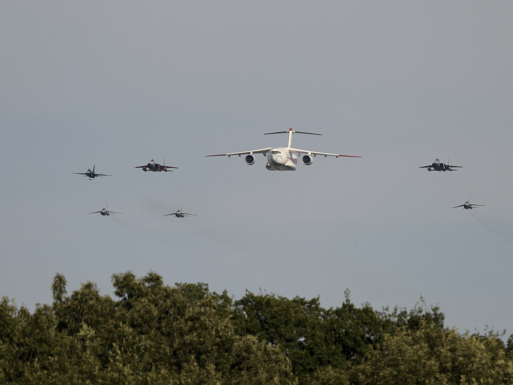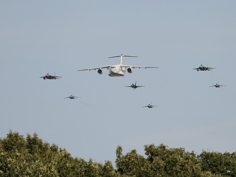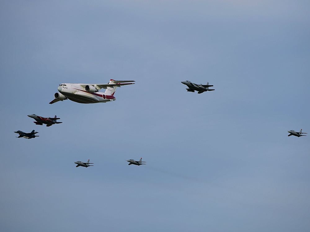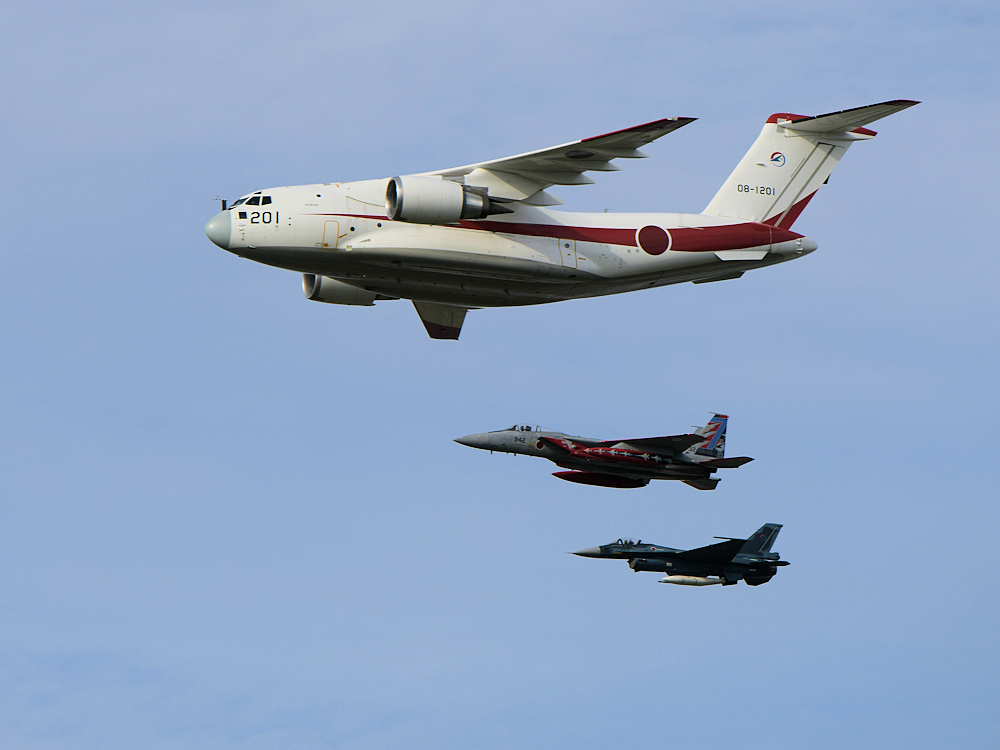 まずはC-2、F-15J(記念塗装機)、F-2Aがエシュロン隊形で航過。