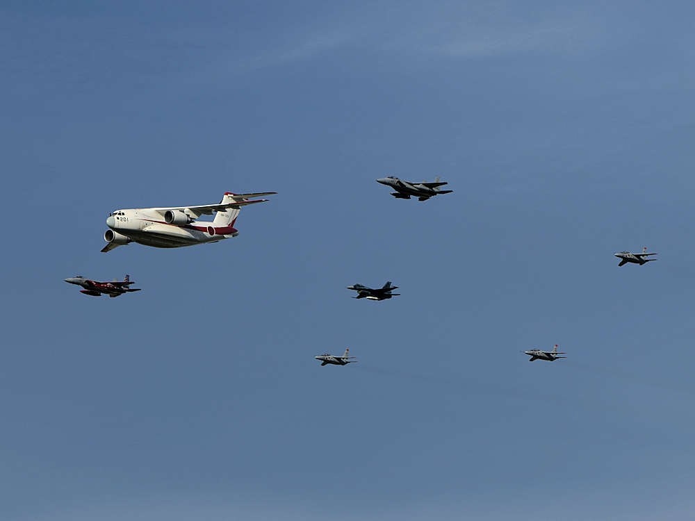 予告された時間となり、C-2が離陸。続いて、F-15、F-2、T-4が離陸。 |