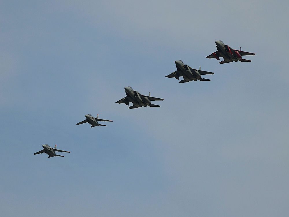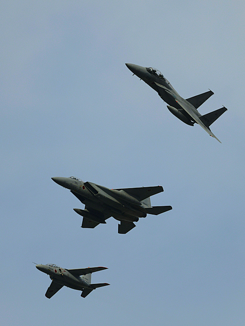 C-2が去ったあと、F-15、T-4がエシュロン隊形で進入。編隊解散して着陸。その後、F-2Aも着陸。 |