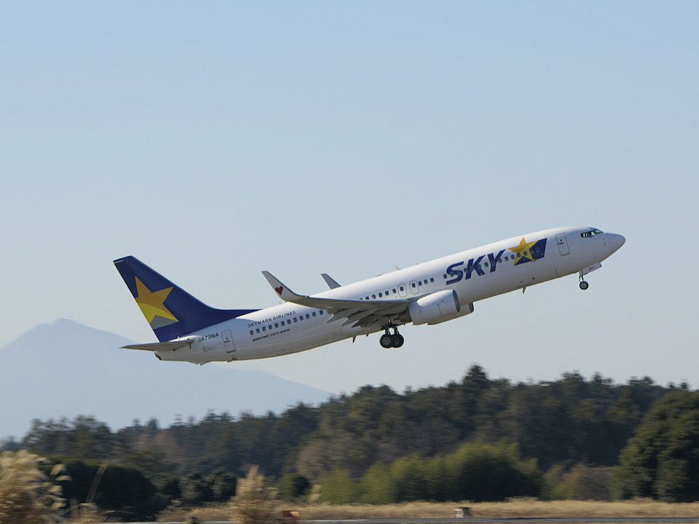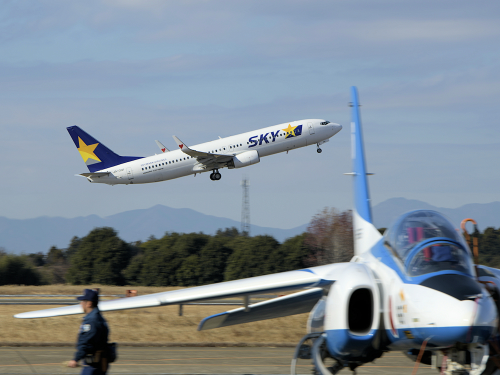 百里基地航空祭特別公開。お向かいの茨城空港からはスカイマークのB737がブルーインパルスを前景にしたり、筑波山を背景にしたりして離陸していきます。