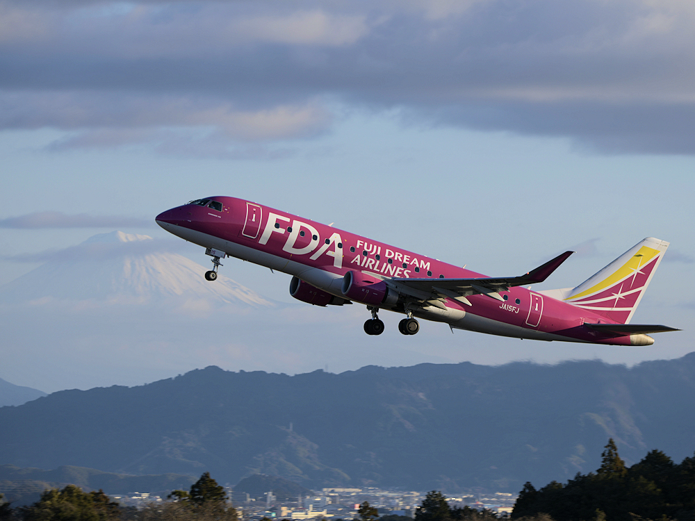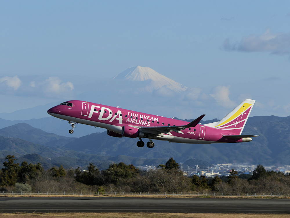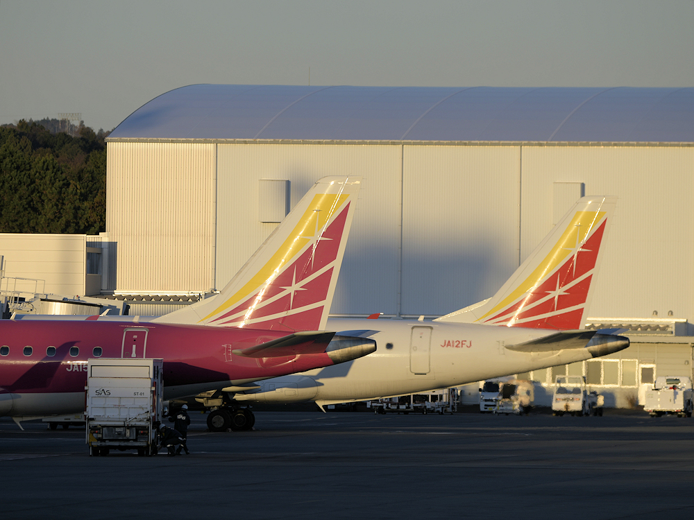 空港に待機するFDA機はめでたい紅白、12号機と15号機。 15号機は初日の出フライトへ。 |