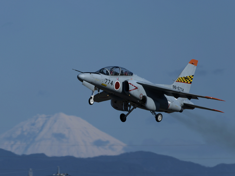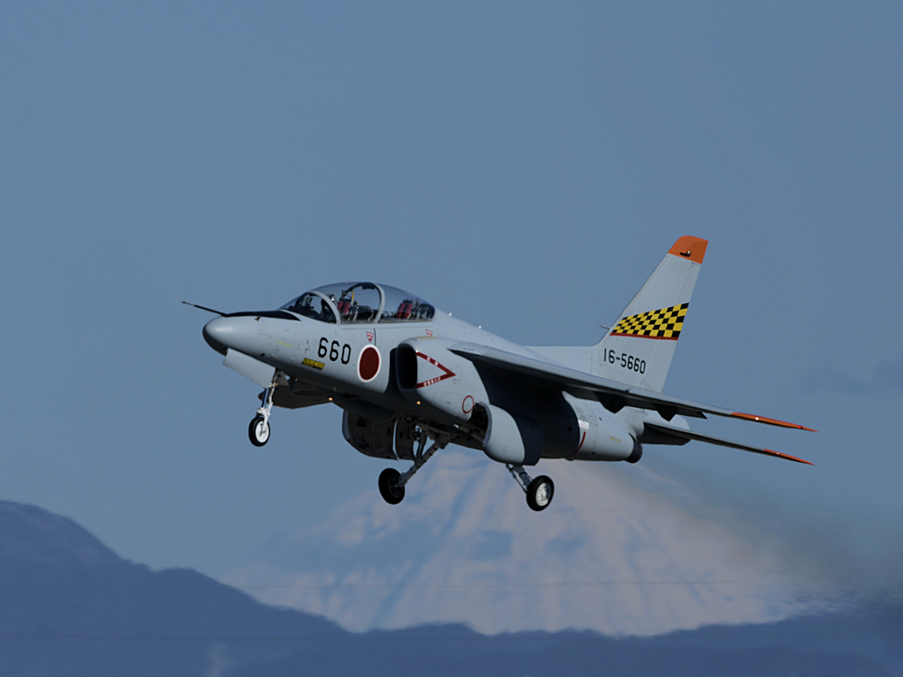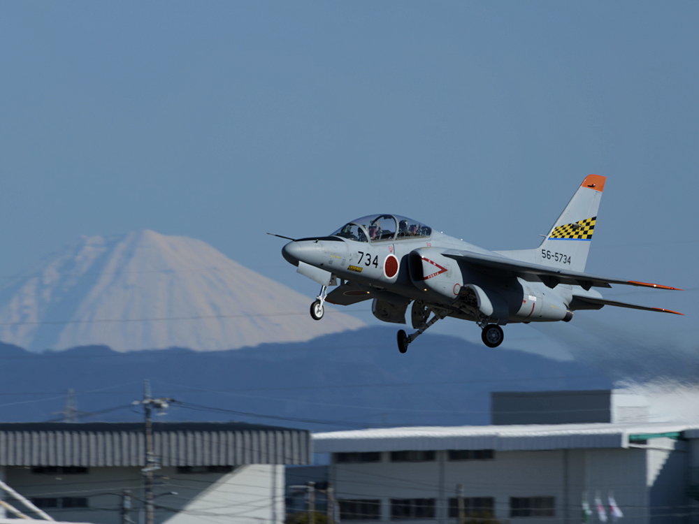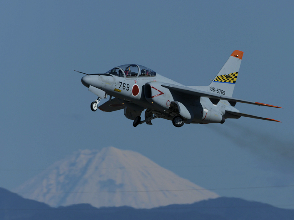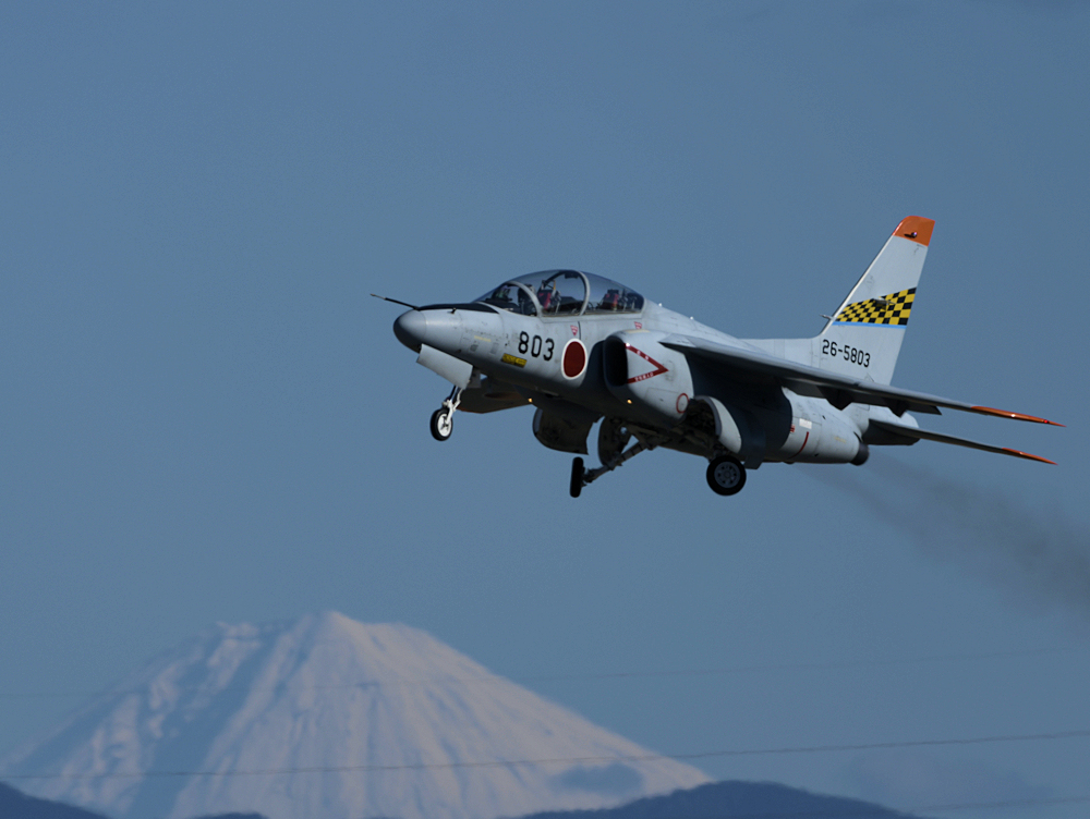 この日も富士山が綺麗に見えていたので、富士山をからめてT-4の離陸を撮影。 | ![]() |