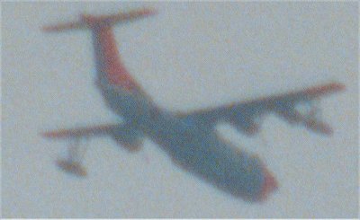 かなり苦しい写真ですが、わかりますでしょうか。これは自宅から上空を飛ぶUS-1Aを500mmズームに2倍のテレコンをつけて撮影したものです。 実は飛行艇が飛ぶ姿を見たのは初めてだったりするのです。 |