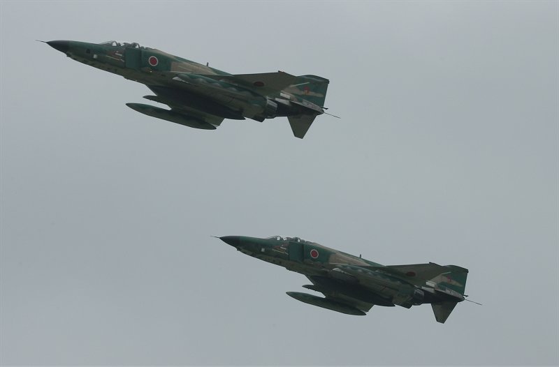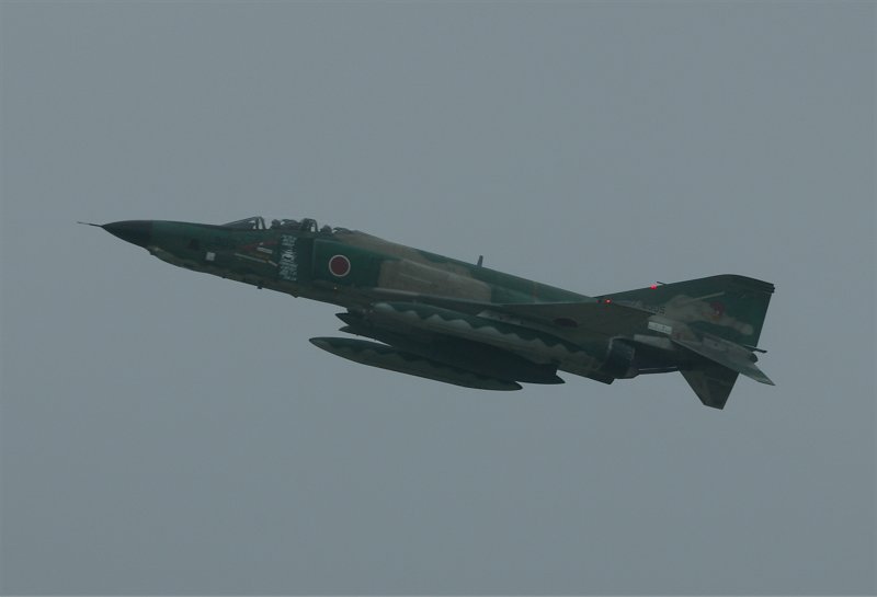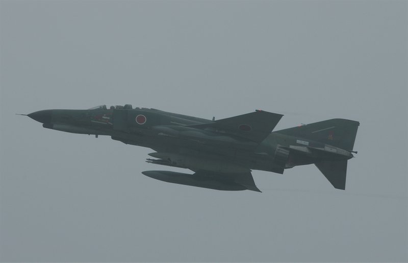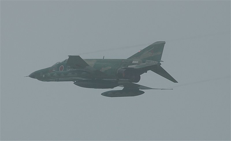 | 501飛行隊のファントムです。あの独特の爆音が嬉しい機体です。 最初からRF-4Eの編隊離陸をおがませていただきました。(左上) しかし、午後の離陸中から小雨が降り始め、これらの写真(右上、下2枚)を取り終えた直後から本格的に降り出してしまいました。 右上のRF-4Eはインテークのところに「ファントム・マーク」らしきものが描かれています。左下はRF-4E、右下はRF-4EJ。 |