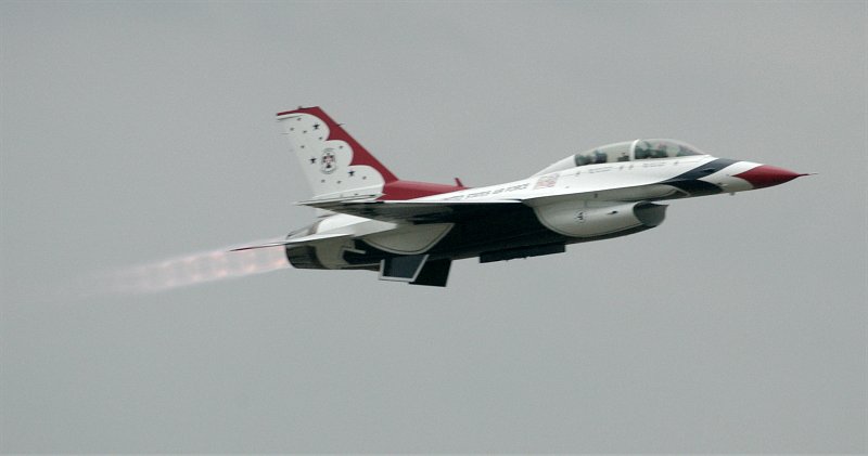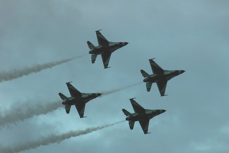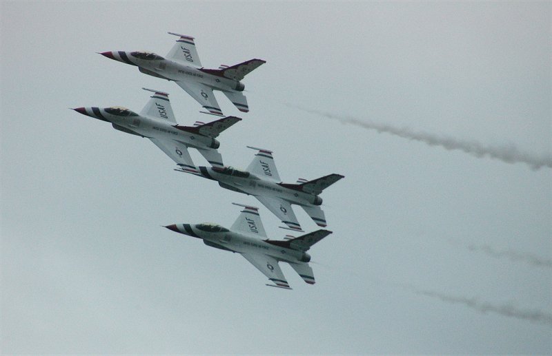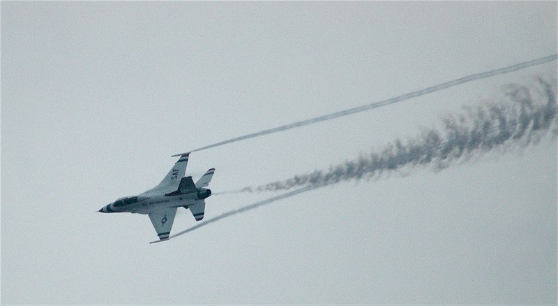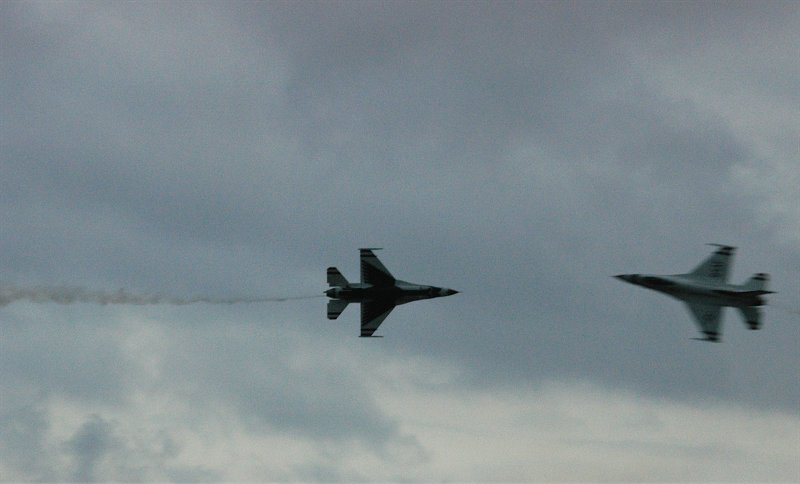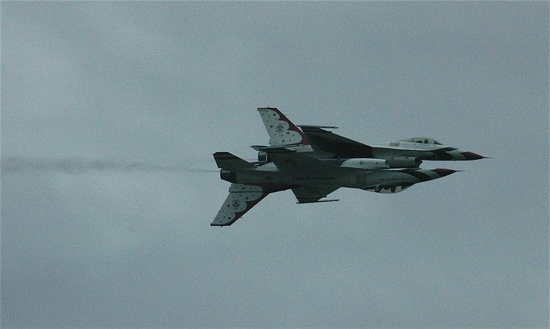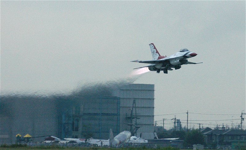 しばし、飛び回る4号。 しばらく後に、次々とアフターバーナーをふかし、F-16が離陸していきます。 ついに、サンダーバーズのデモフライトが開始されたのです。 例のごとく、例のようにクリックすると大判になる写真もあります。 曇天、夕暮れ間近。けして良いとはいえないコンデションの下では、ありますが、素晴らしい飛行です。 |