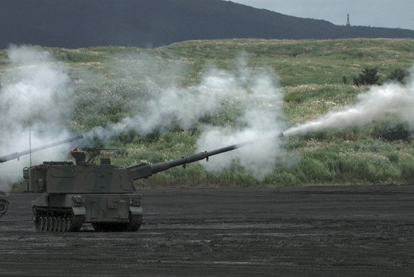 8月28日、台風の日本接近が報じられ、天候が心配されるなか行われた「富士総合火力演習」本番ですが、F-4の航過飛行と空挺航過が中止となった以外は、曇天下ではありましたが、予定どおり実施されました。 さすが、実弾。発射音ではなく発射圧を堪能してきました。 99式155mm自走砲の射撃です。 |