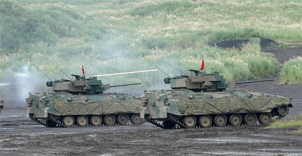 実弾射撃たるもの、曳航弾とマズル・フラッシュを撮らなくては! と意気込んだものの、写っているのは1枚だけでした。しかも、狙っていた車両のものではなかったりします。 さらに、早朝の試射の時の写真だったりもします。 89式装甲戦闘車の35mm機関砲の射撃です。 |