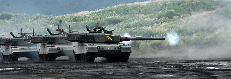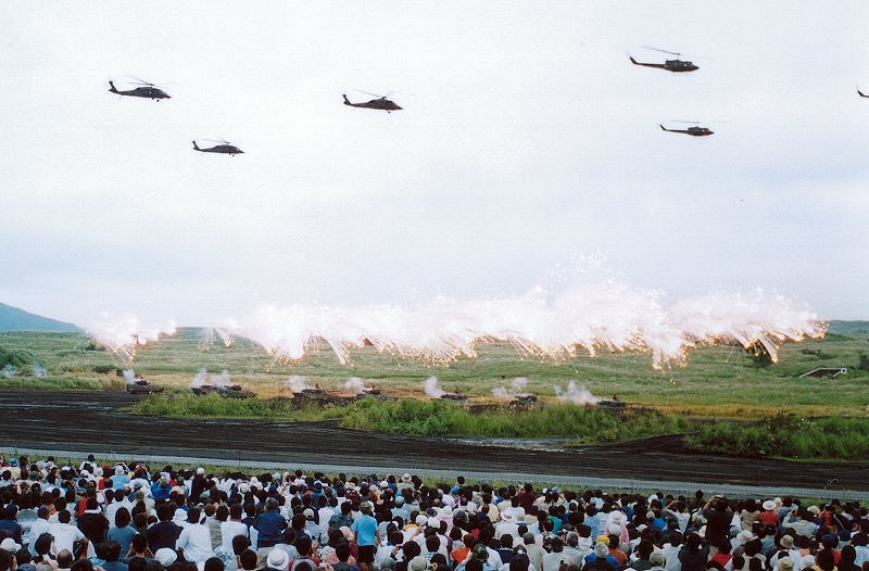 下は90式戦車が走行しながら、4台同時に射撃した直後の写真です。もちろん、ウデが悪いのでマズル・フラッシュは写っておりません。 さらにその下は、フィナーレの発煙弾斉射とヘリコプターの大編隊航過。 |
