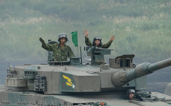 演習終了後、参加した戦車がが横一列に整列(写真上)。壮観です。 そして、帰っていく来賓の方々をお見送りしたあと、午後からの装備品展示のため、一台づつ去っていきます。 手を振る観客に応えて、乗員の方々も手をふりかえしてくれます。 いつものことながら、良い光景です。 |
