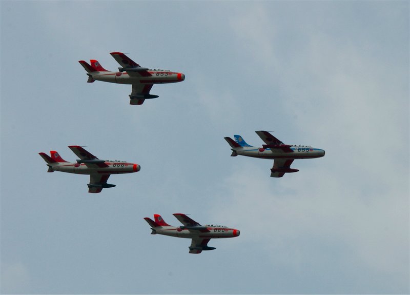 ダイアモンド(左上)にエシュロン(右上)と、見事な隊形で航過飛行するT-1B。
