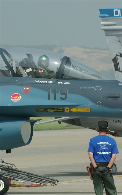 かのブルー・インパルスの基地、松島基地の航空祭。 初めて行ってまいりました。しかし、朝から名物の海霧。オープニング・フライトのF-2が飛んでいますが、霞の向こうにぼんやりとしか、見えません。 そんな、有様ですから、他に予定されていた。T-4、U-125Aのフライトはキャンセルされてしまいました。 待つことしばし。おもむろに滑走路に展示してあった、記念塗装のF-2B「独眼竜」にパイロットが乗り込み、エンジンを始動。(左) 見ると、霧も開場当初ほどではなくなっています。 F-2の機動飛行展示の開始です。 |