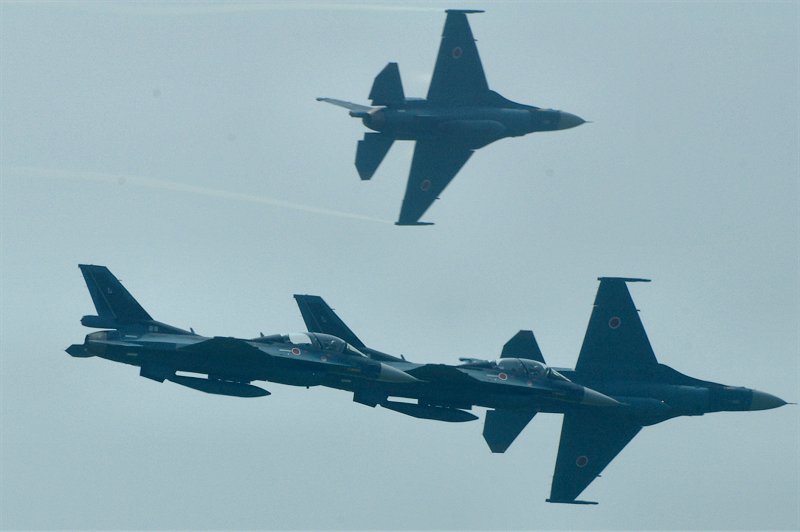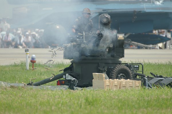 午前中の締めはF-2、6機による編隊航過と空対地射爆撃。視界が悪いせいか、編隊の組み直しに妙に時間をかけていました。 上は対地攻撃のため、ブレイクするF-2編隊。左は迎え撃つ対空機関砲。はき出される薬莢がその連射性能を物語っています。 撮影する我々も上に下にと大忙しでした。 |