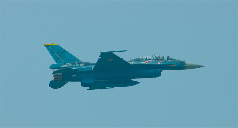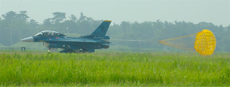 | かのブルー・インパルスの基地、松島基地の航空祭。 2日目です。しかし、朝から昨日以上の海霧。オープニング・フライトのF-2は一機だけがシミュレーション・テイクオフ、他の機体はタキシングのみ。しかも、霞の向こうにぼんやりとしか、見えません。 そんな、有様ですが、昨日同様、おもむろに滑走路に展示してあった、記念塗装のF-2B「独眼竜」にパイロットが乗り込み、エンジンを始動。 上は飛行中の写真の中でも、独眼竜がよくわかるものを選びました。 下はドラッグ・シュートを引いたまま、タクシー・バックしてくる独眼竜です。 |