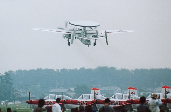 左上はCH-47。わざわざ身をのりだして手を振ってくれています。 そのあと、機体を振りながら帰路につきました。 E-2Cもプロペラで輪っかを描きながら離陸。(左、左下) |