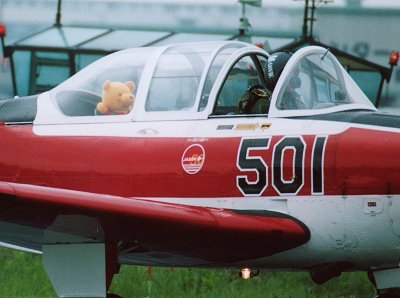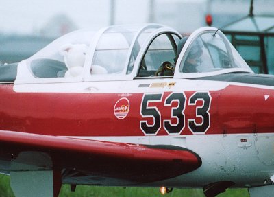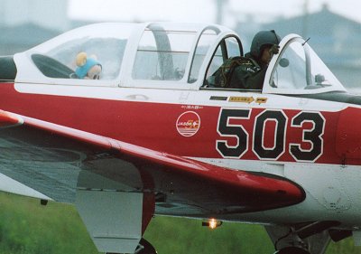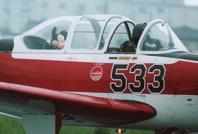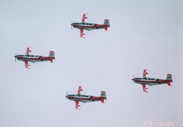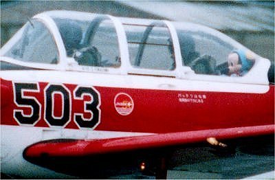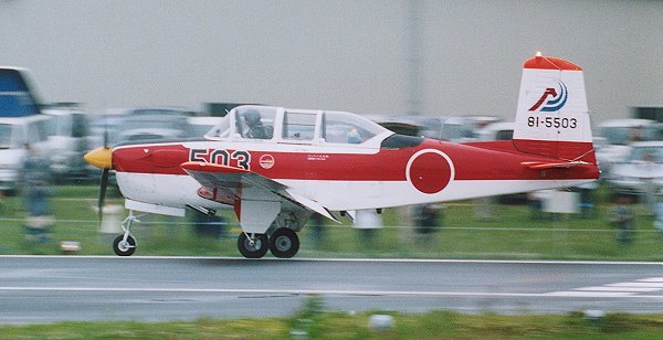 それでも、雨の合間もぬって、ホスト役のT-3は午前と午後に展示飛行を行ってくれました。 そう遠くない将来に、T-7に初等練習機の座を譲りわたしてしまうのですが、雨の中でもまだまだその魅力はおとろえません。 |