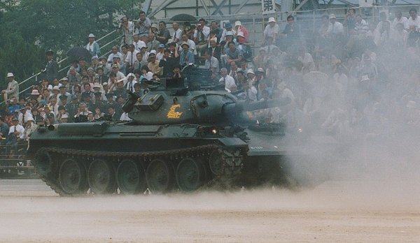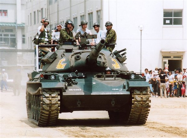 体験搭乗といえば、戦車。 2台の74式がグラウンドで行っていました。 百メートルちょっとくらいを後退、前進で往復するだけなのですが、皆さん非常に満足そう。 他にも、軽装甲車、高機動車などの体験搭乗が行われ、いずれも大人気で、順番待ちの長い列ができていました。 |