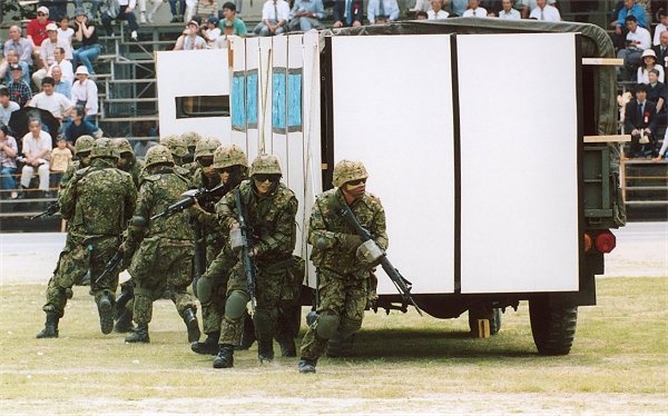 いよいよ、テロリストの本拠に突入です。(左) 74式戦車も援護砲撃してきます。(左下) それにしてもユーモラスなのは、小屋に偽装したトラックです。 この状態で走ってきたのですが、その姿は笑うしかないものでした。 |