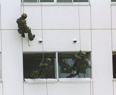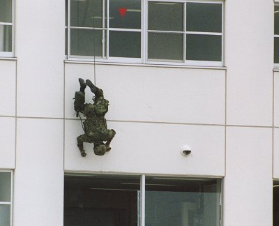| さて、人質をとってビルに立て籠もったテロリストに対し、レンジャー部隊が救出作戦を敢行します。 まずは屋上に密かに展開し、上からロープ降下。そして、中の様子をうかかがいます(左上)。この時、見ていた子供たちが「あ、スパイダーマンだっ」と嬉しそうに叫んでいました。やっている方が、かのアメコミ・ヒーローを意識していたかどうか、定かではありませんが、確かにアクションは似てました。ガス弾を投入と同時に、突入(右上)。 |