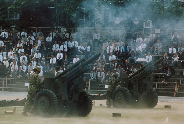 ラッパドリルにつづいて、大序曲「1812」の演奏です。 某テレビ番組で紹介されて以来、すっかり有名になってしまった「大砲を楽器として使う」あの曲です。 毎度のことながら、曲にあわせて入場し、さらに射撃準備をする姿は見事です。 しかし、今回はなんと言っても近かった。空砲の風圧が来る距離でみていたので、これを作っている時点でもまだ耳鳴りが・・・ それを考えると、ビクともせずに演奏を続けてらっしゃる音楽隊の皆さんは立派です。 |