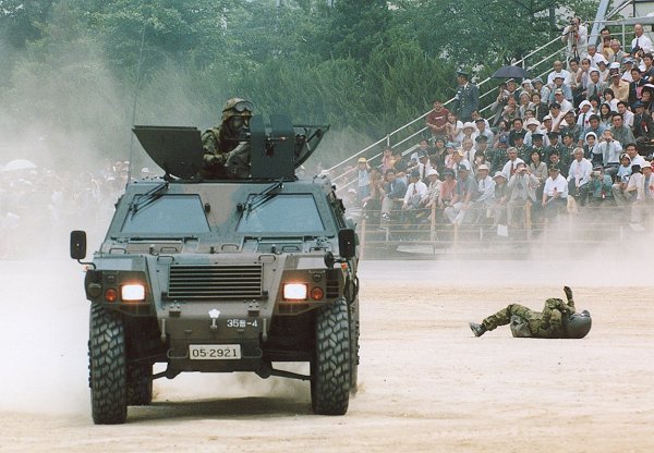 敵が化学兵器を使用し、偵察隊員が犠牲になったとの想定のもと、救助隊の援護のため、展開してきた軽装甲車(左)。 この偵察隊員さんの「化学兵器にやられましたっぷり」が見事で、ウケてました。 |
