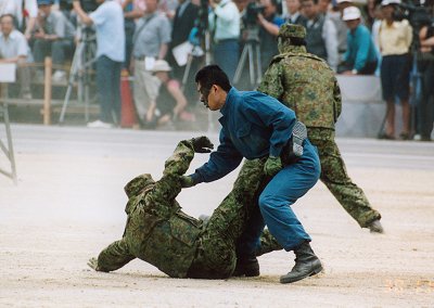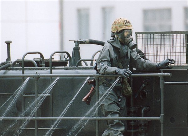 毒をまくファントム兵士、ではなく、除染車を用いて化学兵器に対する中和剤を散布している化学科隊員。 今回の模擬戦は対テロリスト戦を想定して行われました。 大量殺戮兵器を持った小グループとの戦いを考慮しなければならない世の中なのです。 |