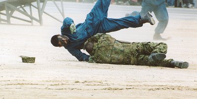 ![]() ビルから追い出されたテロリストは人質を連れたまま、逃走をはかります。銃火器を使用すると、人質も危ないので、格闘戦です。 なんか、ノリノリで戦ってますが・・・・(左、上) |
