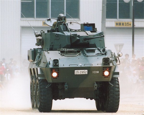 そして、いよいよ模擬戦です。 対空ミサイル、りゅう弾砲の展開に続き、オートバイ、そして、偵察警戒車(左)による敵地偵察が行われます。 |