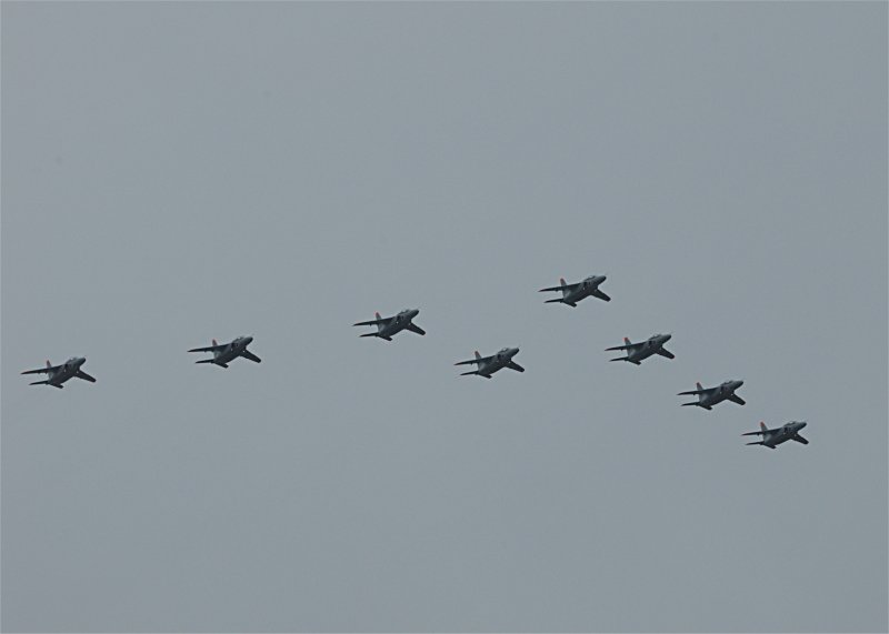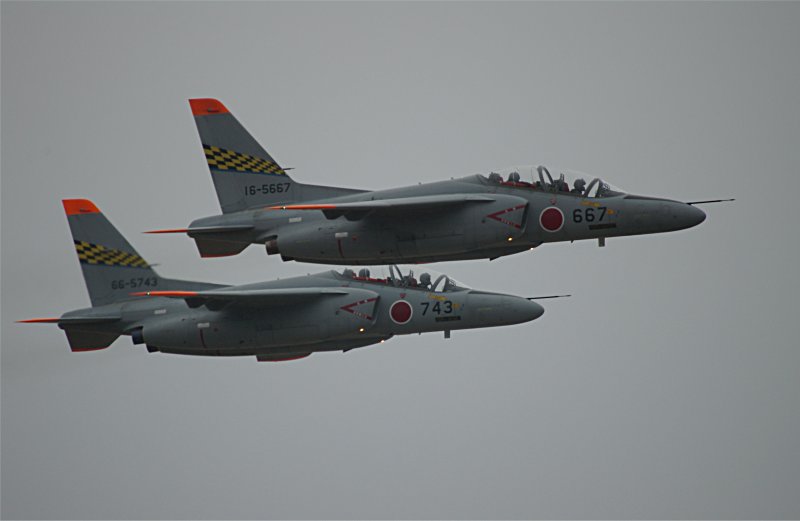 救難展示終了後、8機のT-4が2機づつ編隊離陸(左下)。残る2機は単機で離陸。
