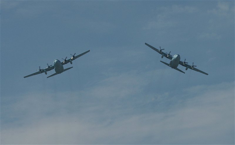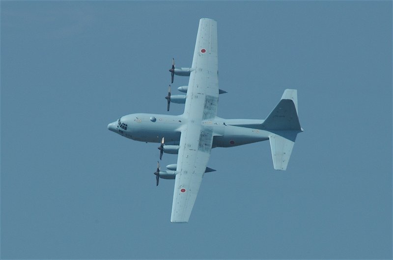 みてのとおり、今回は蒼空迷彩(イラク派遣塗装)のC-130が飛行展示を行いました(左上)。 しかも、会場正面からの進入も可能ということで、いきなり大技! 正面から進入していきた二機が左右に分かれ(右上)、大きく旋回し、左右から低空で会場に進入(左)、交差します。 残念ながら、交差の瞬間は「見てしまった」ので、撮れていません。 |