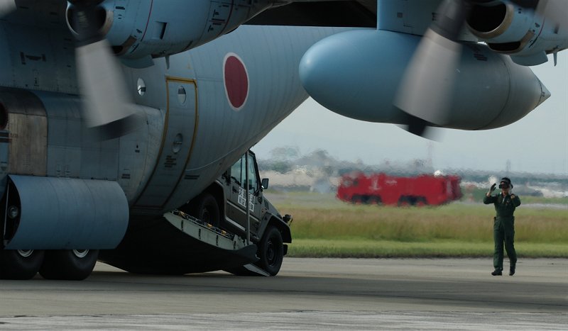 また、旋回も比較的近くで回ってくれますので、背中もよく見えます(左) 災害派遣展示でも活躍します。 物資投下(左下)、車両搬出(下)。 いつもの、「歓迎小牧基地」がでてくると思いきや。いきなり車両が出てくるので、ビックリです。 もちろん、どの写真もクリックすると大判で見ることができます。 |