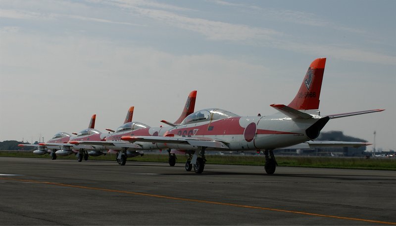 午前と午後の2回飛行し、今回は機動飛行さえ披露してくれました。 機動飛行を行ったのは、増槽なしの2機です。 普段はタンク付きで飛んでいるので、クリーンな機体が妙に新鮮に見えます。 左上:午前の展示飛行のため、タキシー中の4機 上:午後の部を終え、ふたたび駐機位置に 左:午前の部 定番の編隊離陸 |
