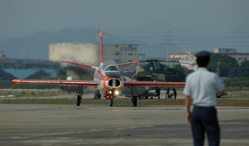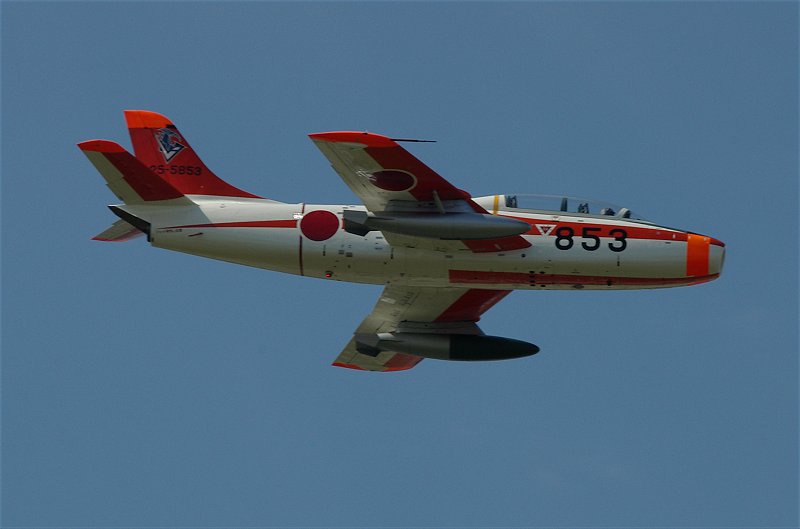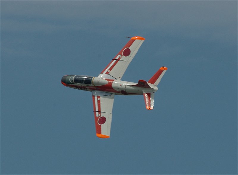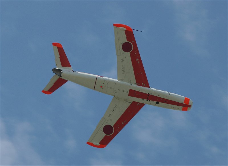 せっかくなので、T-1Bの三面をご覧ください。 左:コンバット・ピッチのため会場に侵入 下二枚:360度旋回中 青空に赤系と白の機体がよく映えます。 この快晴は、最後の小牧航空祭展示となるT-1Bに捧げられたのかもしれません。T-1Bは今年度中に全機退役してしまうのです。 |