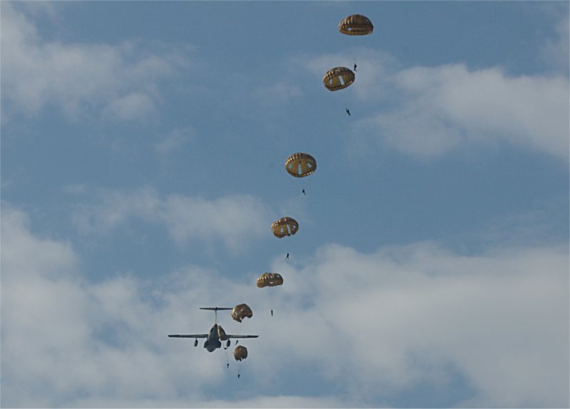 そのC-1から、1名が試験降下したのち、10名が次々にC-1から飛び出します(右下)。