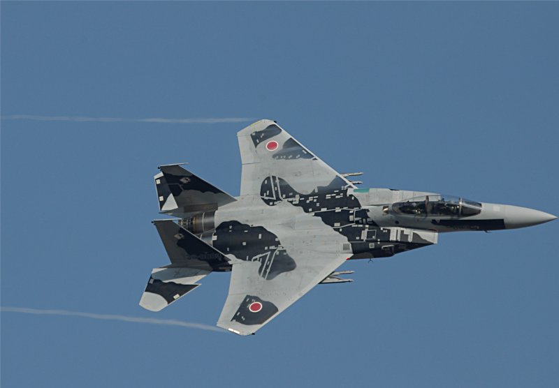 オープニング・フライトの次は教導隊のF-15DJ、2機による機動飛行展示です。独特な塗装の「あの機体」がダイナミックな飛行を見せつけてくれます。(上2枚、左、下2枚)
