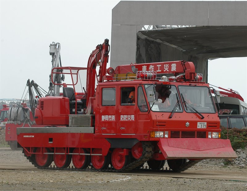 上の「震災工作車」になると、緑の巨大輸送機の一番装備にそのまま入っていても違和感がないのではないでしょうか。