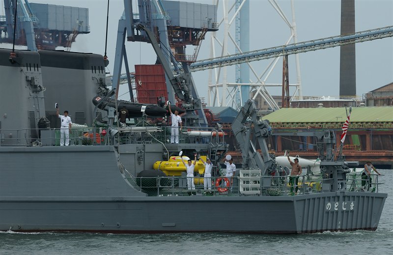 展示されていた護衛艦は掃海艇〈のとじま〉のみ。体験航海を行っていました(左上)。その後部甲板ですが、機雷処理用の特殊装備が満載です(右上)。この妙にメカメカしい様子が実に良いです。