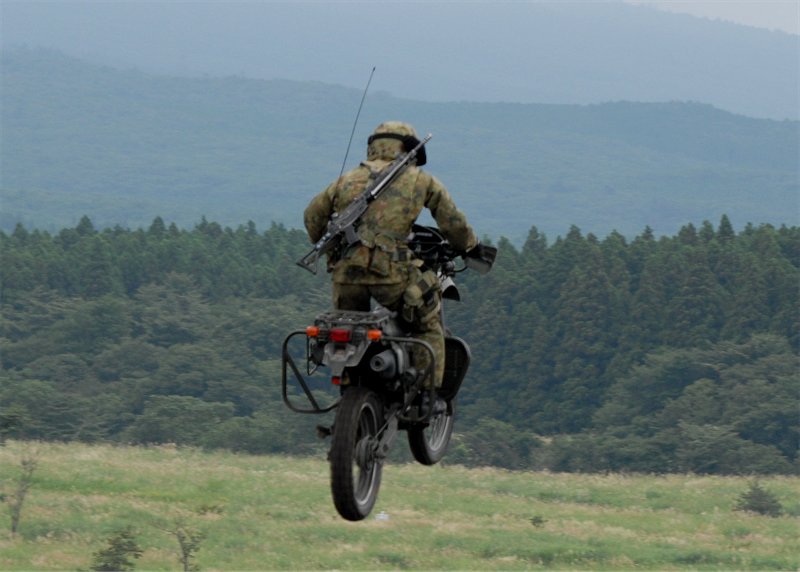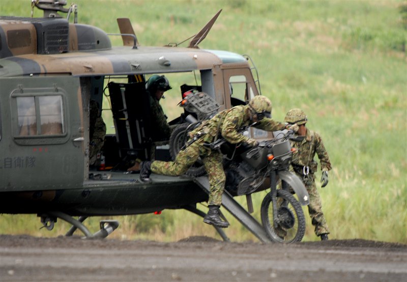 UH-1から飛び出すオートバイ偵察偵察隊員(左上)。