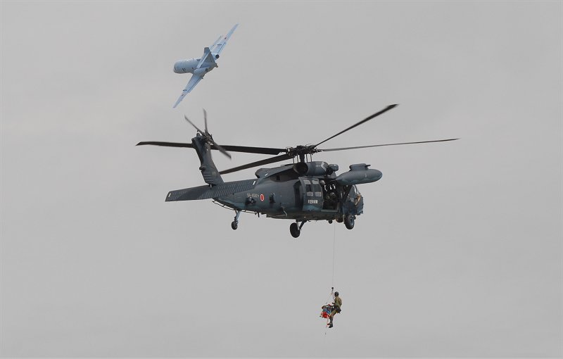 上中:救難作業中のUH-60Jの周囲を警戒旋回するU-125A